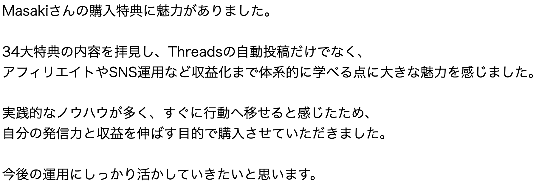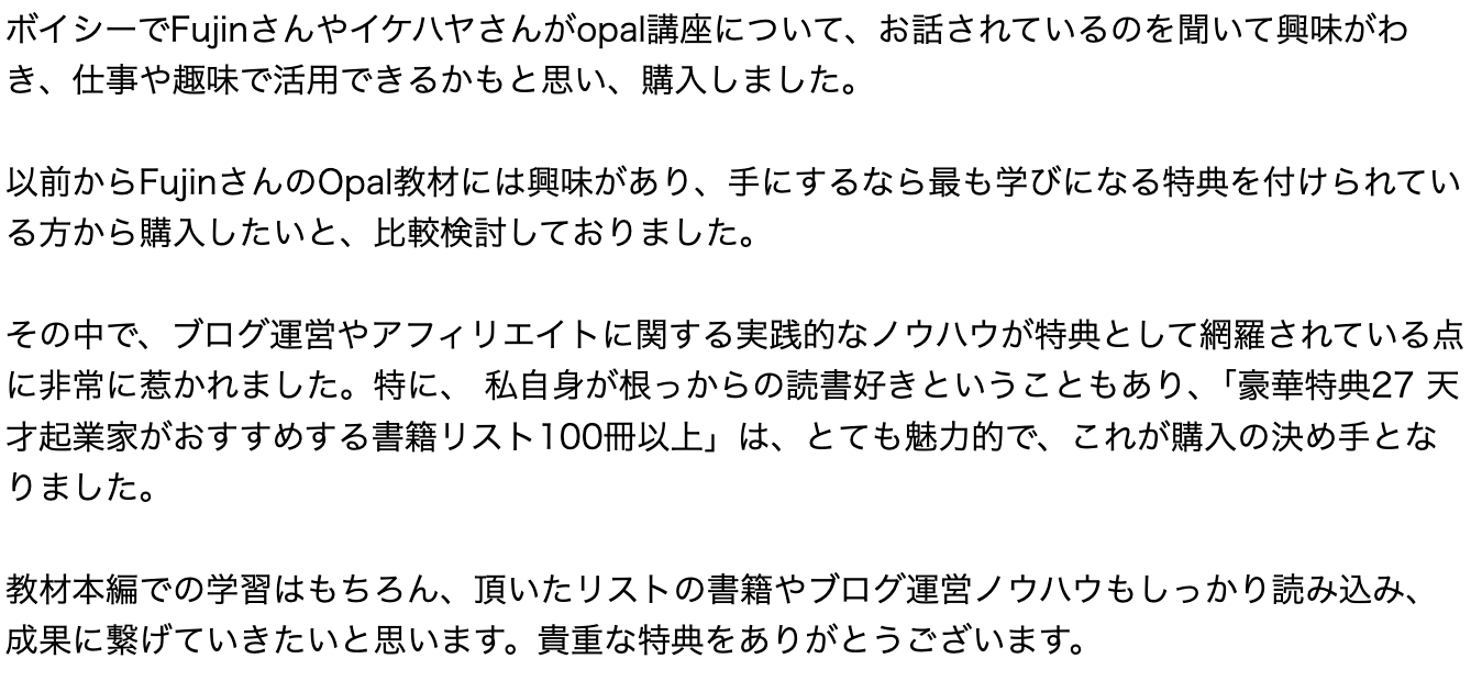 このページでは、Brain、Tips、PARK、深夜マーケットにて、当サイトの特典付きリンクからご購入いただいた方々の「リアルな声」をそのまま掲載しています。